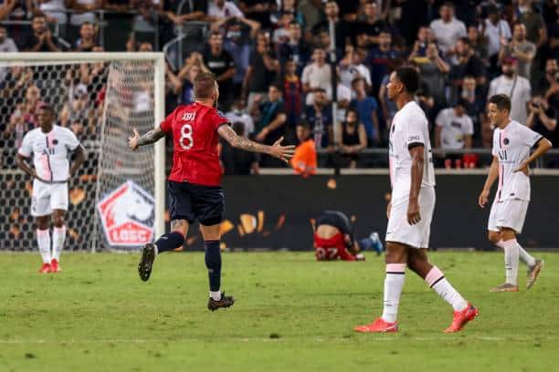 แต่แล้วนาทีที่ 45 “ตราหมา” ลีลล์ ทะยานออกนำก่อน 1-0 จากการเล่นลูกทุ่มทางซ้ายมาให้ บูรัค ยิลมาซ สอดมาเก็บบอลในเขตโทษก่อนจะแทงย้อนหลังให้ เชก้า ตะบันด้วยขวาหน้ากรอบ 18 หลา โค้งพุ่งผ่านบล็อคแนวรับ เปแอสเช ผ่านมือ เกย์ลอร์ นาวาส เข้าไปซุกก้นตาข่ายอย่างงดงาม